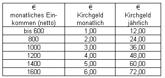 Der Mindestbetrag der Kirchensteuer wird auf 3,60 EURO im Jahr, 0,30 EURO im Monat, 0,07 EURO pro Woche, 0,01 EURO pro Tag festgelegt. Er wird nur erhoben, wenn Lohn- oder Einkommensteuer unter Beachtung von § 51a Einkommensteuergesetz anfällt.