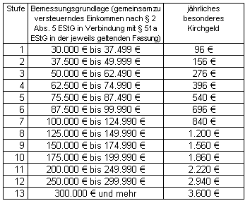 Tabelle für das besondere Kirchgeld gem. § 2 Abs. 2c Kirchensteuerordnung