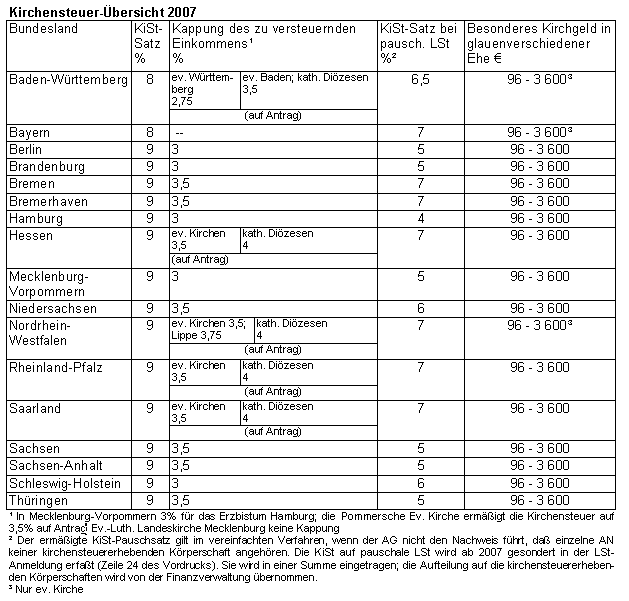 Baden-Württemberg: Ev. Landeskirche Württemberg 2,75%; Ev. Landeskirche Baden, kath. Bistümer 3,5%